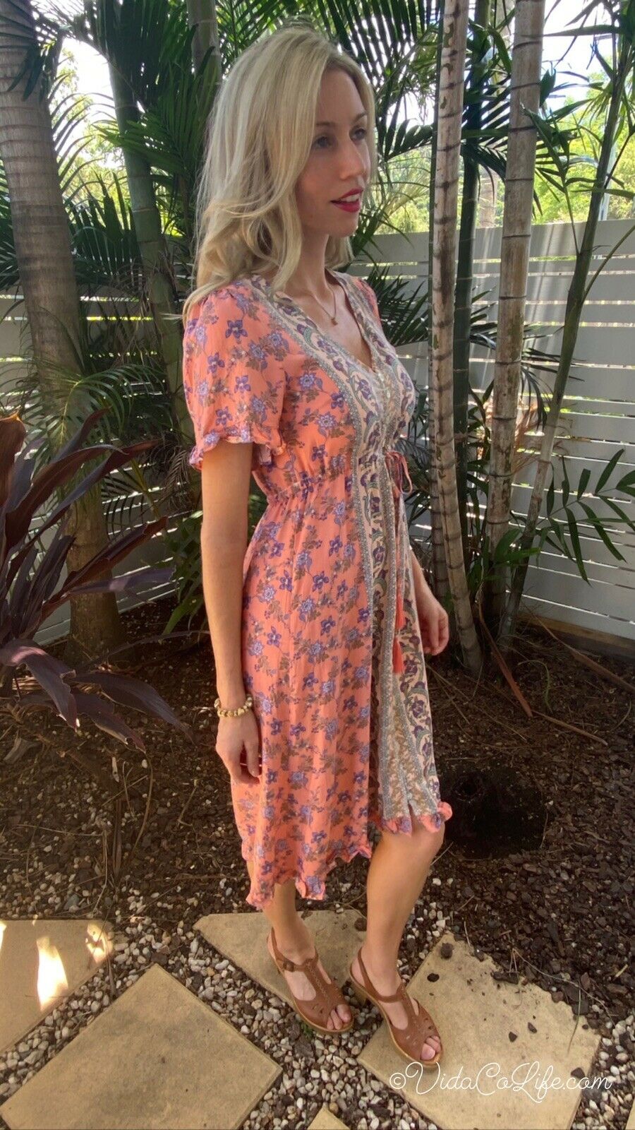 Salty Bright dress in Sunset Orange - Beautiful Floral Pattern with floral detailing, features v-neckline, button front through with short flutter sleeves with effortless waist tassel ties. The garment is perfectly put together with a frilled hemline.