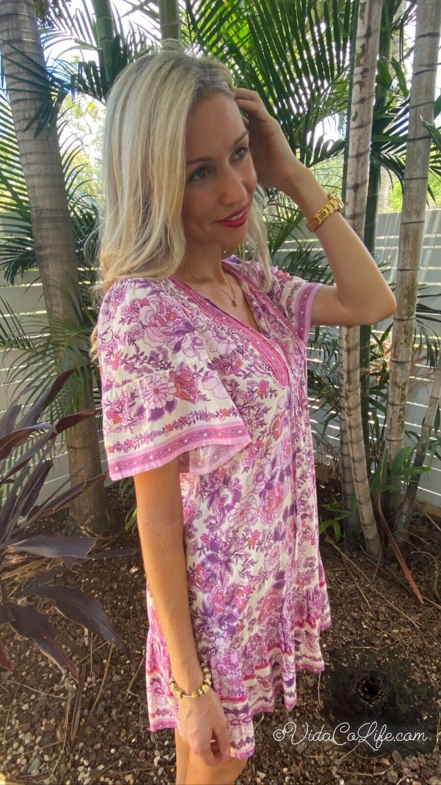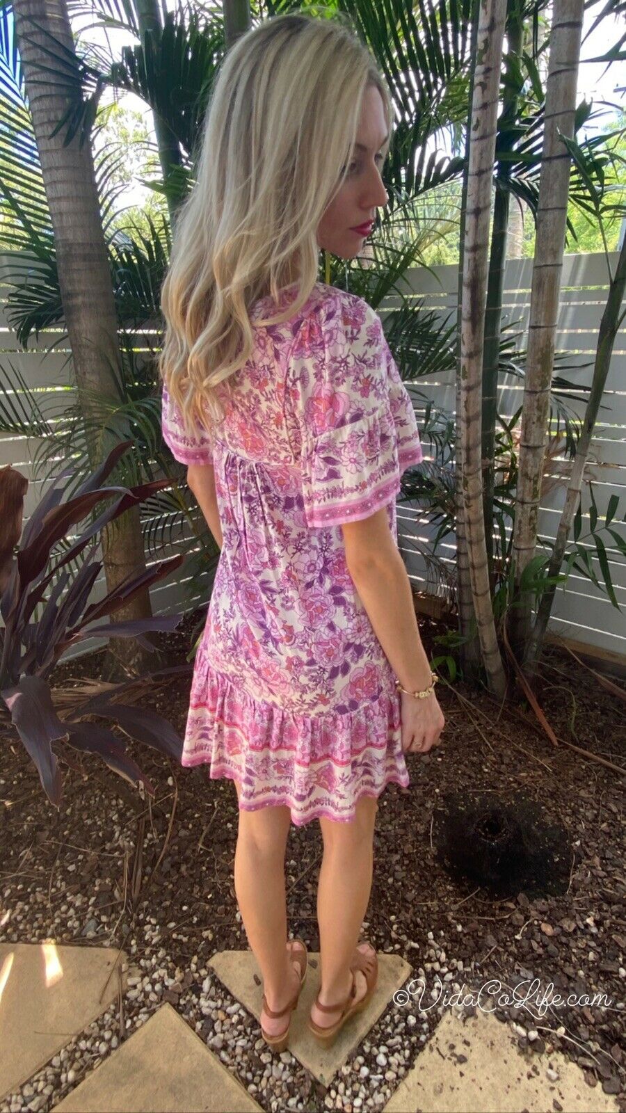 Stunning Salty Bright shirt dress. Babydoll pink - Beautiful Floral Pattern with lilac and pink pretty floral detailing, features v-neckline, button front through with short flutter sleeves with effortless neckline tassel ties. Channel your inner bohemian goddess inside and out as the dress feels so soft and the design so stunning. A must in every girls wardrobe. Accessorise with an anklet & sandals.