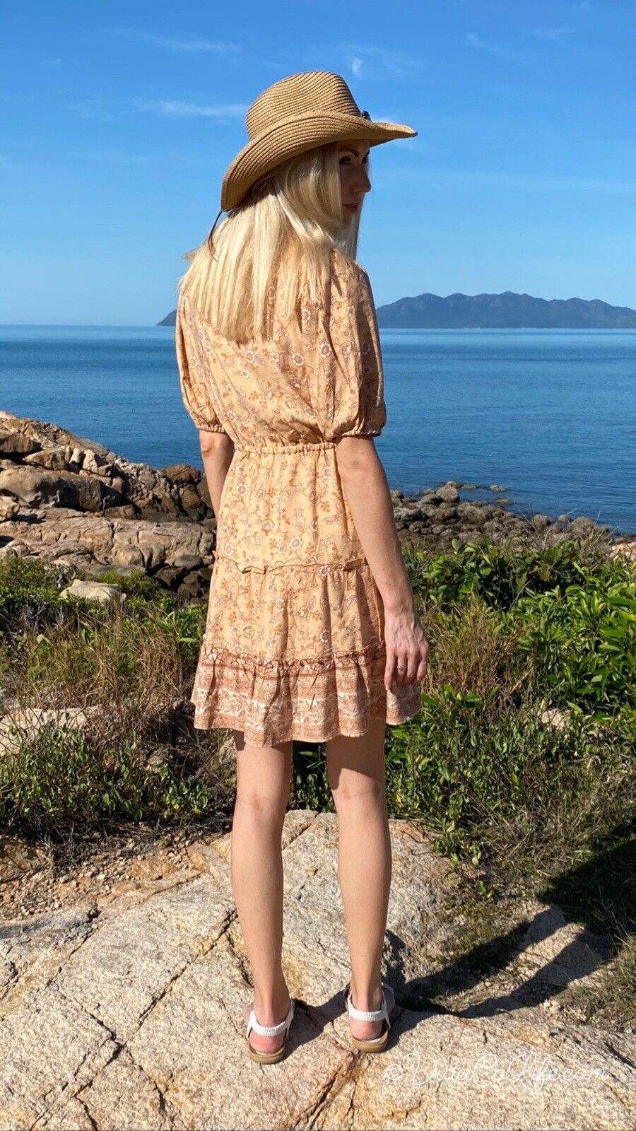 Grace & Co Dress with a stunning floral bohemian print. Warm Beige, Light Brown and cream with floral detailing, featuring a v-neckline with button closure, short puffed elastic sleeves with effortless waist tassel ties. The garment is perfectly put together.